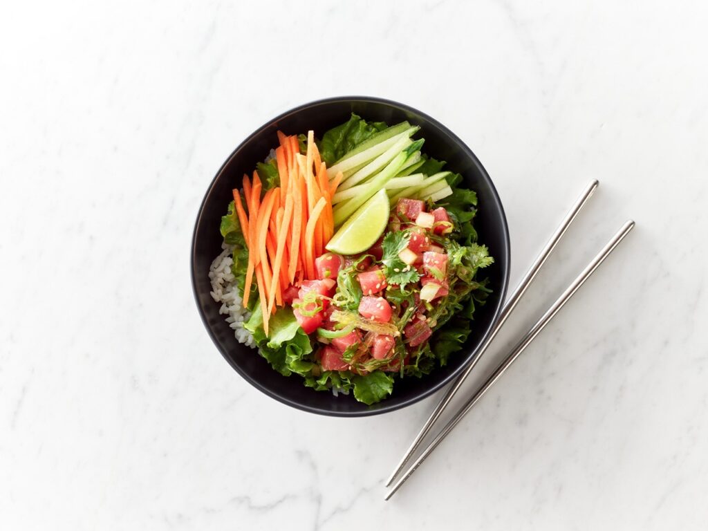 Marinated tuna (tuna, seaweed salad, yellow onion, green onion, cilantro, ponzu sauce, chili oil), lettuce, cucumber, carrot and rice. Topped with sesame seeds and lime wedge.
