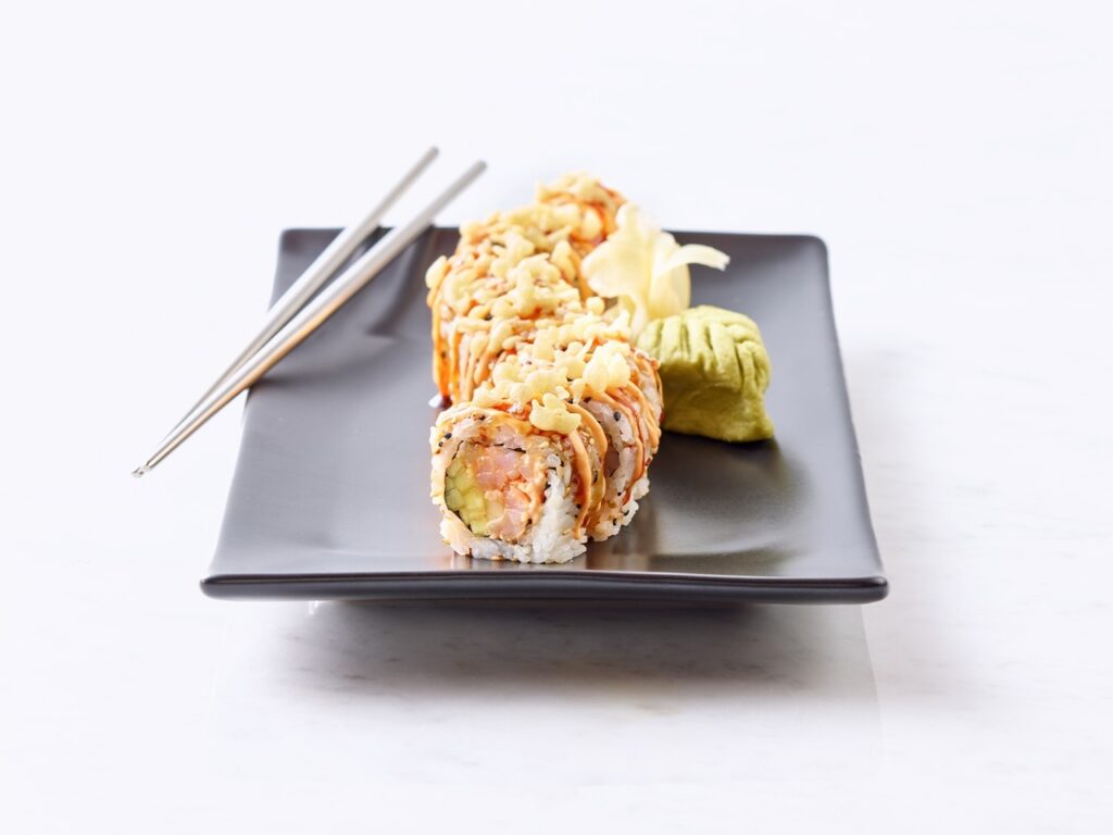 Spicy shrimp and cucumber wrapped in rice and nori. Topped with tempura crunch, Japanese BBQ sauce and spicy mayo.